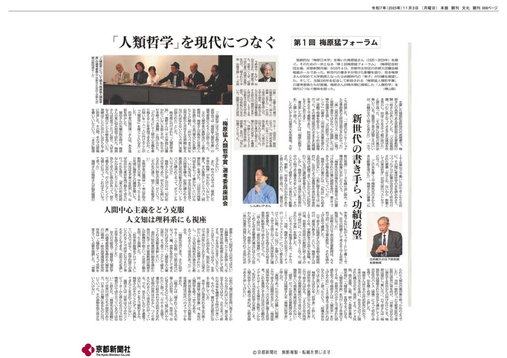 第一回梅原猛フォーラム「梅原猛を継ぐ~『人類哲学』とは何か」(10月4日、京大芝蘭会館稲盛ホール)のレポートを掲載しました。京都新聞の特集記事と全発言録もお読みいただけます。