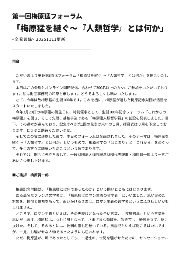 梅原猛生誕100周年記念フォーラム「これからの梅原猛」(3月20日、京都大学稲盛財団記念館)のレポートを掲載します。